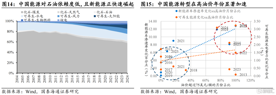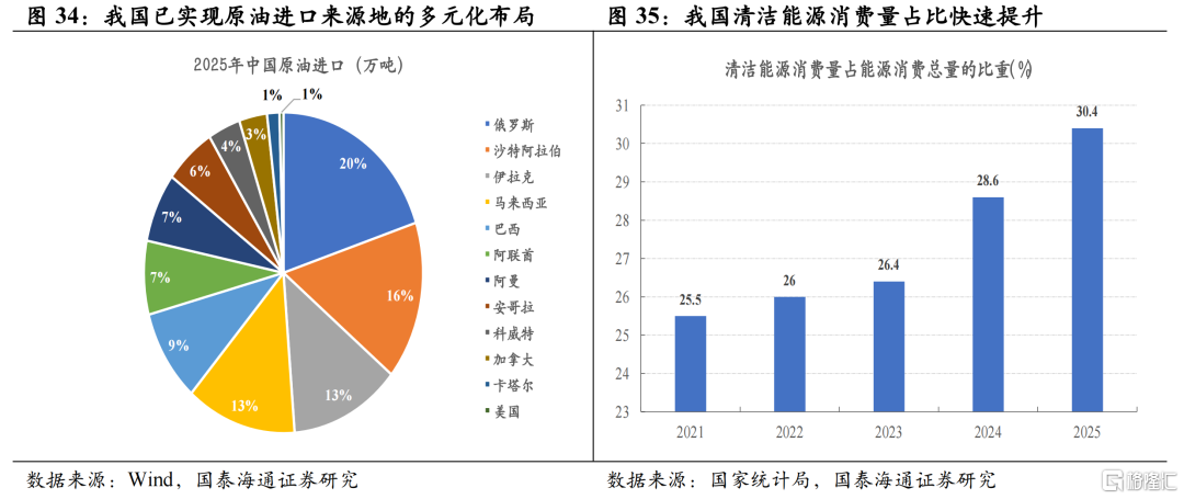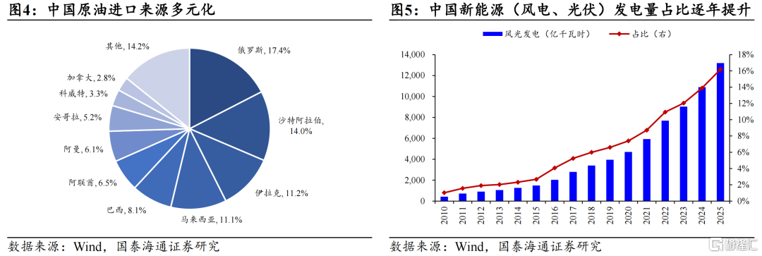 中国能源结构对油气依赖度低,且供应来源多元分散,具备较强的能源安全优势。从能源结构上看,中国一次能源消费以煤炭为主,且自给率长期在90%以上,石油、天然气占比不到30%,显著低于全球平均水平,较高的能源自给率为外部冲击提供了显著的缓冲垫。其次,虽然我国原油进口依赖度较高(2025年约72%),但进口来源已形成了“中东+俄罗斯+非洲+美洲”的多元化格局,有效避免中东单一供给冲击带来的影响。最后,中国新能源装机规模全球领先,2025年风电、太阳能合计发电量占比达16.2%,新能源的大规模替代,有效降低了经济增长对进口化石能源的边际依赖,为能源系统在外部冲击下提供了重要的调节弹性。