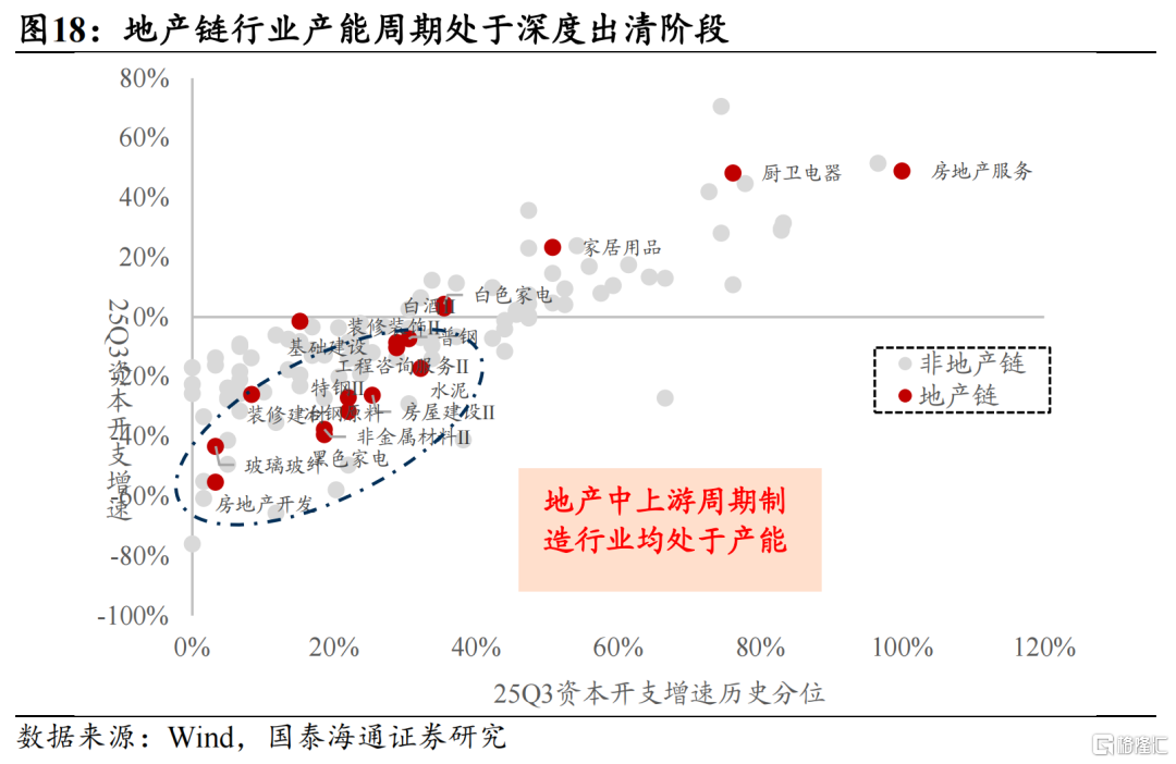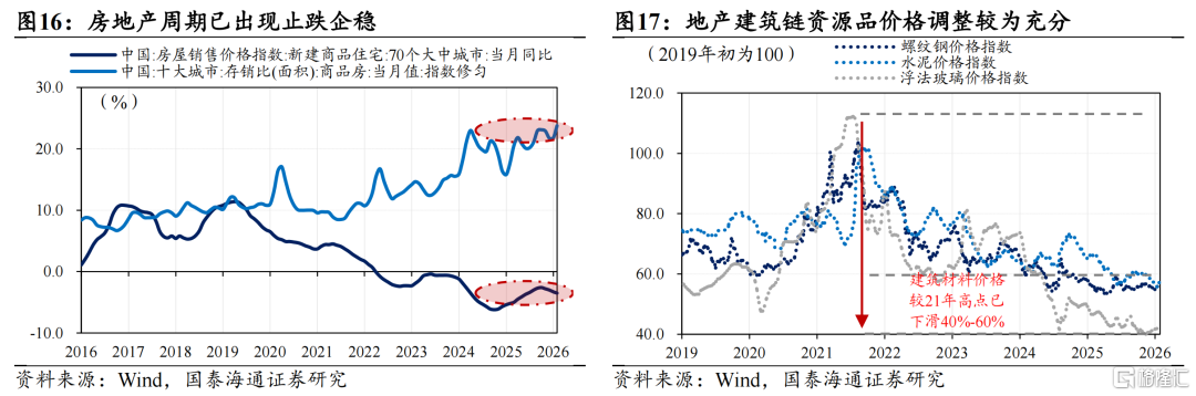地产对传统经济拖累的最大时刻或已过去,地产链普遍处于产能周期深度出清阶段。2025年以来房地产市场已经出现了明显的止跌企稳迹象,商品房存销比结束快速上行趋势,转而在区间内震荡,房价跌幅也不再扩大;地产建筑资源品价格也经历了充分的调整,钢铁和建材价格普遍较2021年高点回落40%-60%,地产链行业的投资正在明显下滑,投资增速大多处于历史低位,表明传统地产链行业正处于产能周期深度出清阶段。国泰海通证券认为房地产和地产建筑链行业对传统经济拖累的最大时刻或许已经过去,中国经济转型所面临的不确定性因素正在减少。