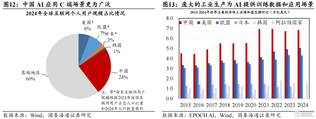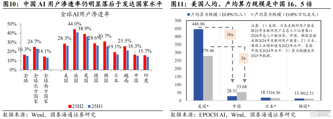 中国算力建设尚处早期,国内AI算力投资与应用生态仍有极高的成长空间。中国在人工智能基础设施领域与美国差距巨大,资本开支扩张仅一年且处于扩张周期;人工智能产业具有极强的马太效应与全球化特点。从AI用户渗透率来看,截至2025下半年,中国AI用户渗透率为16.3%,相较于发达国家20%-40%的渗透水平仍有较大的提升空间;从算力基建的规模来看,美国人均、产均算力规模是中国的16、5倍,这表明我国AI技术的应用以及算力基础设施的建设仍然处于相对早期的阶段。与此同时,我国拥有全世界最大的互联网用户群体和工业产值,这为AI应用提供了大量的训练素材和广阔的应用场景。据此,国泰海通证券认为国内AI算力投资以及AI应用和生态的发展仍有极高的成长空间。