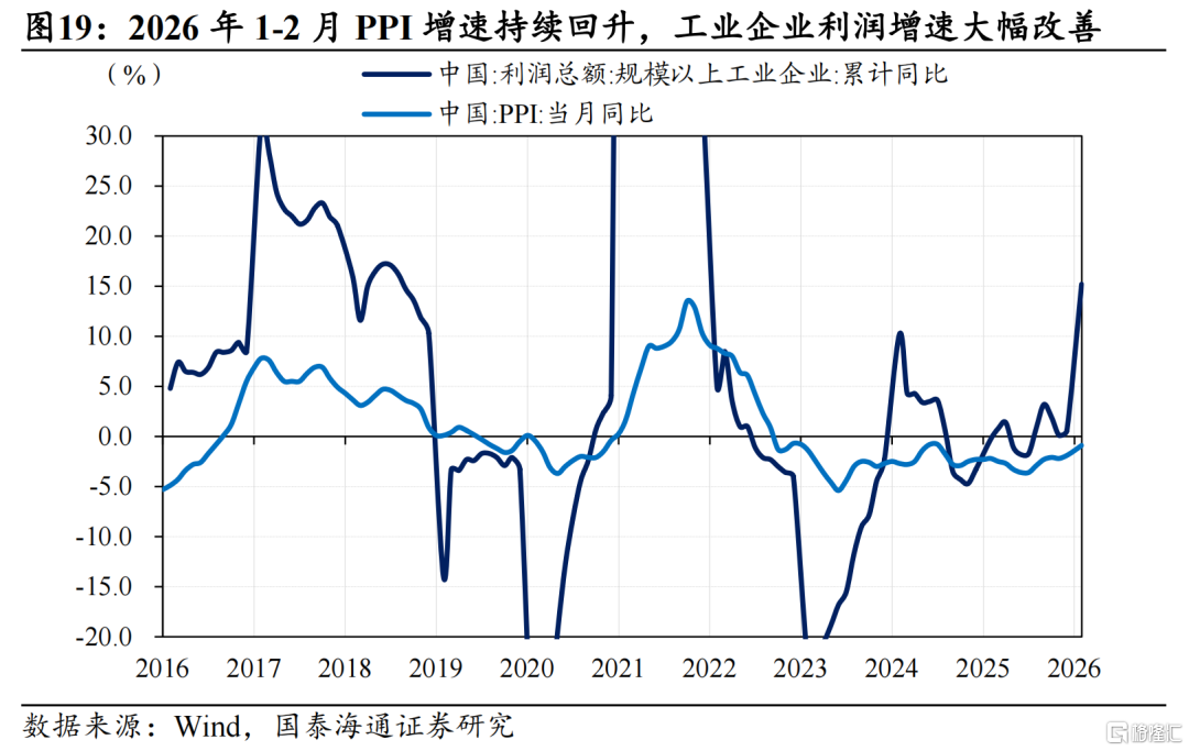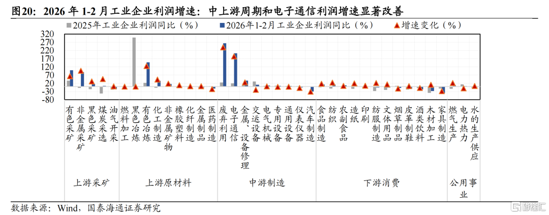 2026一季度业绩前瞻:总量修复加快,周期板块景气扩散,新兴科技盈利中枢上升。2026年以来中国经济复苏趋势有所加快,受益于国际大宗价格的上涨以及新兴产业对实物资产需求的拉动,周期资源品的涨价线索有所增多,并带动PPI增速温和回升。2026年1-2月工业企业利润同比+15.2%,较2025年全年增速(0.6%)大幅改善,结构上来看中上游的原材料和燃料以及AI硬件制造产业利润增速提升较为明显,此外中下游制造利润增速保持相对平稳。国泰海通证券认为2026年一季度A股上市公司的业绩也会呈现复苏加快的趋势,周期板块增长线索有望增多,新兴科技盈利中枢或进一步提升。