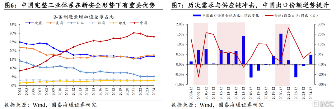 中国完整工业体系与供应链韧性,在地缘新形势下有望迎来重估。中国是全球唯一拥有联合国产业分类中全部41个工业大类的国家,制造业增加值占全球比重约 30%,“全产业链+高效物流+成本可控”的制造体系正从单纯的“成本洼地”升级为全球供应链中不可多得的“稳定锚”。可以发现历次全球风险事件与需求冲击下,中国制造业均展现出了强大韧性,出口份额逆势提升(09-10年金融危机后、14-15年全球贸易寒冬、2020年疫情冲击)。当前伊美冲突等地缘事件再度凸显全球供应链的脆弱性,中国制造的稀缺优势有望迎来重估机遇。