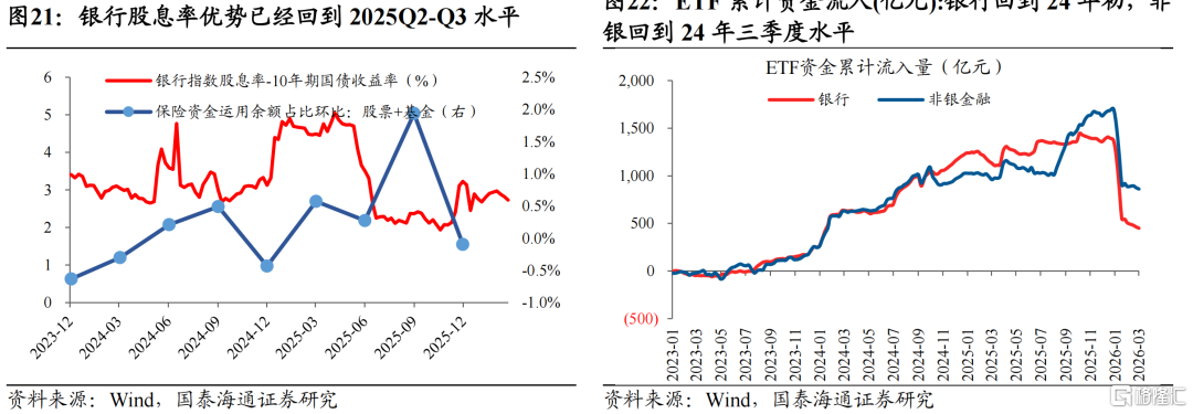 大金融:市场重要权重与稳定器,在当前地缘不确定性较高的背景下具备配置价值。金融板块股息水平已具备吸引力,银行股息率优势基本回到2025Q2-Q3水平,长期资金有望重新增加金融稳定板块配置。此外,宽基ETF带来的资金流出压力已经显著收敛,2026年来ETF资金大幅流出金融板块,以2023年初为起点,当前银行/非银的ETF累计资金流入规模分别回到24年初/24年三季度,且边际来看ETF流出压力明显放缓。国泰海通证券认为在地缘不确定性仍较高的当下,金融作为市场重要权重与稳定器,已经具备较高的配置价值。