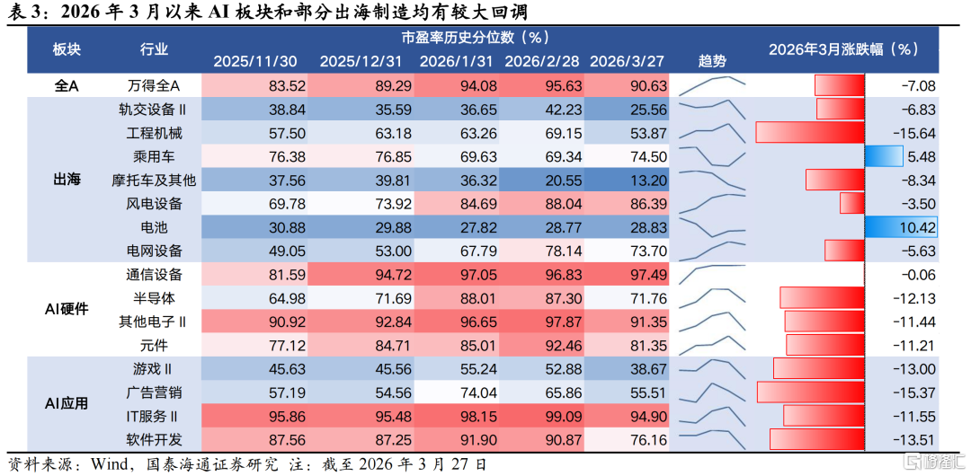 2026年3月以来,受地缘冲击影响,风险资产估值承压,AI产业链和部分出海制造(工程机械/两轮车/轨交)回调幅度居前。国泰海通证券认为,当地缘冲突对成长股估值的压制不再扩大时,业绩兑现能力较强的新兴科技板块有望迎来估值修复。
