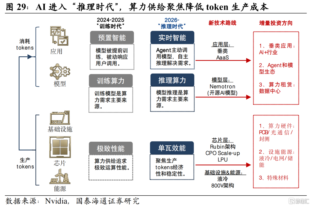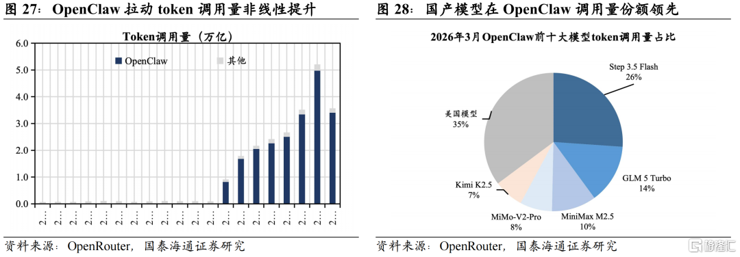 AI:Agent应用带来推理算力需求爆发,中国AI模型和算力产业将充分受益。2026年以来,随着OpenClaw的横空出世,Agent应用取得了重大突破,并引领token消耗的非线性增长。根据OpenRouter数据,2026年2月是OpenClaw应用的爆发拐点,该平台所统计的所有AI应用调用量出现跃升,其中OpenClaw的token调用量显著增加是这一变化的核心驱动因素。国产AI模型凭借性价比优势充分受益于OpenClaw推理算力需求的增长,截至2026年3月,OpenClaw前十大调用模型中有5个国产模型,且国产模型的token调用量占比达到65%,超过美国模型调用量。国泰海通证券认为随着AI模型能力提升与Agent应用发展成熟,2026年AI算力供给将从“训练时代”追求极致性能转向“推理时代”聚焦生产token经济性和稳定性。新路线蕴含增量投资方向:芯片(PCB/光通信/封测);能源和设施(液冷/电网/储能);应用和模型(垂类/Agent/算力租赁)。