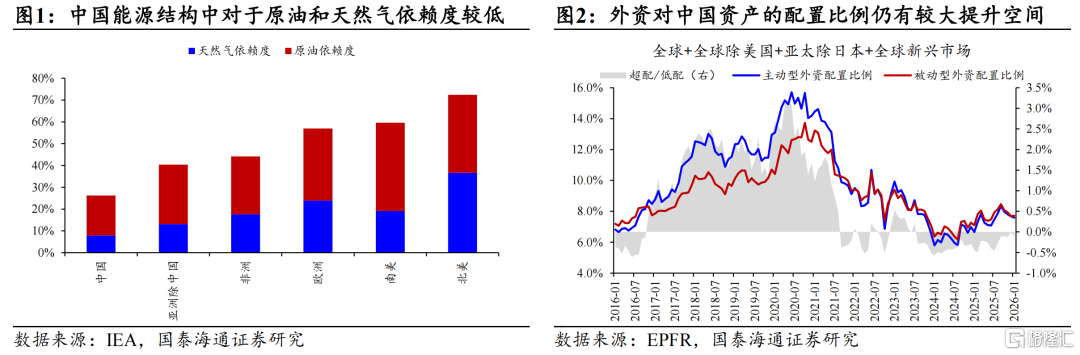▶稳定是中国经济与股市的底色,中国市场具有更低的风险评价。在地缘冲突“新常态”下,“高确定性”的资产具有更低风险评价:1)中国能源结构中油气占比不到30%,显著低于全球平均,且进口来源多元分散,能有效避免中东单一供给冲击影响,而新能源的发展进一步增强能源系统韧性。2)中国拥有全球最完整的工业体系,在历次风险冲击下均展现出了强大韧性,如08-09年金融危机、14-15年全球贸易寒冬、2020年疫情冲击,中国出口份额均保持了韧性与提高。3)能源价格高企与运输受阻冲击全球需求,2026年中国经济政策重心以内需为主导,采取扩张性的财政取向,并更大力度地支持消费并推动投资止跌回稳,内需企稳有望对冲全球需求的回落。4)中国特色稳市机制的完善提升股市抵御风险的能力,加之中国资产本身与全球资产低相关带来的风险分散价值,有望吸引全球资本。