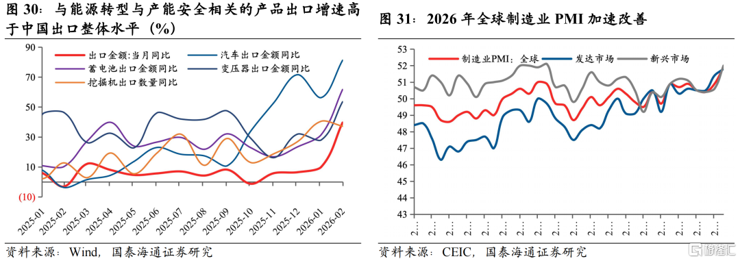 出海:全球能源转型和产能安全需求提升,国内资本品出海有望延续高景气。2026年全球制造业PMI持续改善,年初扩张速度有所加快,国泰海通证券认为这主因地缘升温预期下,全球能源转型与产能安全需求上升,各国加大对能源设备和战略资本的建设,国内相关的资本品出口增速显著高于出口整体水平。