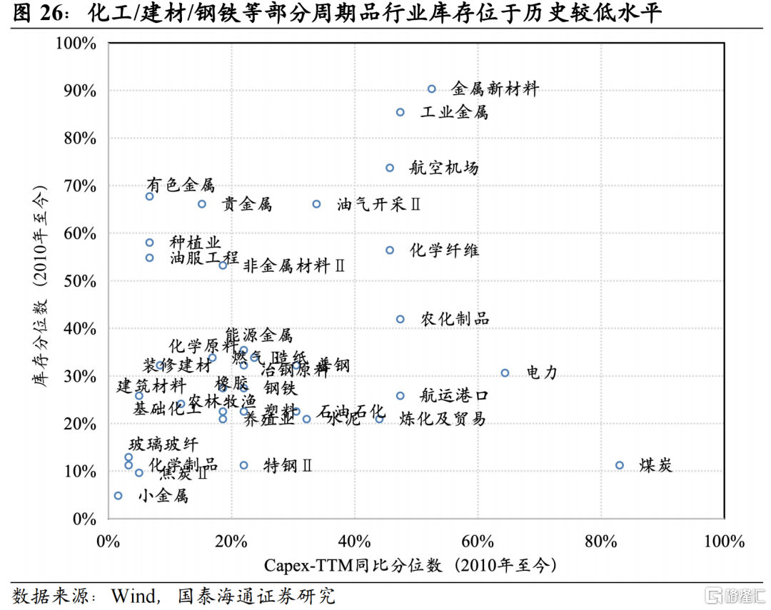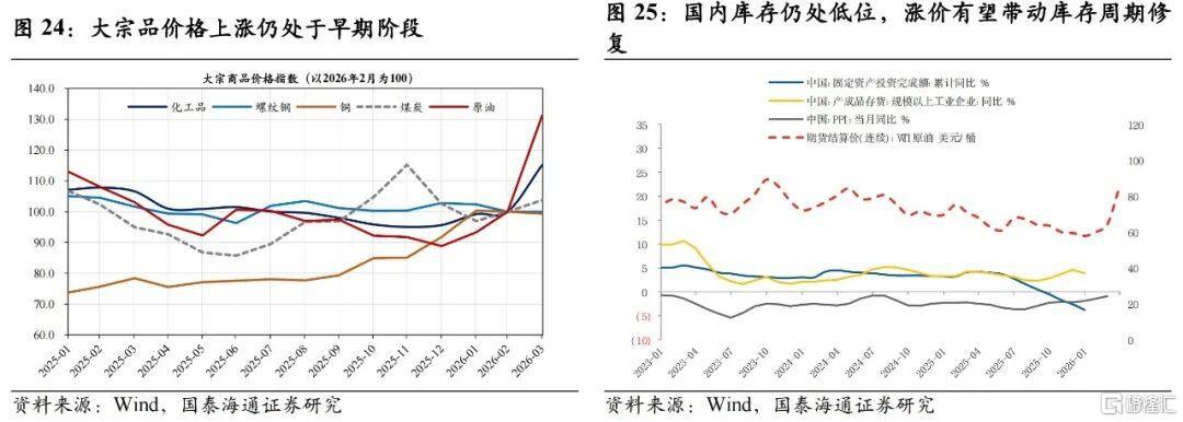 周期资源:原油链产业供应短缺预期影响下,下游补库或带动大宗品价格补涨。国泰海通证券认为本次冲突战前市场低估油价和原油链涨价趋势,因此本轮冲突发生前,相关产业或并未进行充足的补库。2025年我国库存增速整体处于历史低位,并且PPI负增持续压制企业补库意愿。冲突实际发生后,原油供给扰动超出市场预期,这体现为原油/化工品价格的飙涨。在霍尔木兹海峡的航行受阻后,国泰海通证券认为原油链产业供应短缺的预期将带动原油链相关产业的补库进和大宗品价格补涨,关注产能与库存双低的化学制品/建筑材料。