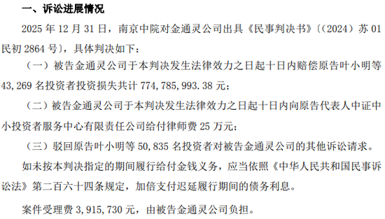 金通灵被判赔偿7.75亿元,券商将承担多少连带责任?根据2025年12月31日南京中院出具的判决结果,金通灵需要向原告4.3万名投资者赔偿7.75亿元投资损失,驳回5万多名原告其他诉讼请求,律师费25万元、案件受理费391.57万元由金通灵公司负担。金通灵需要在发生法律效力的10日内赔偿。